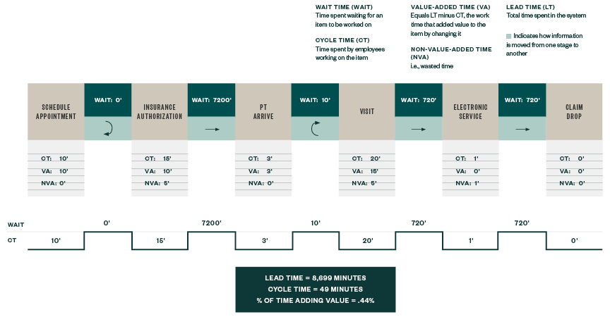Waste can be easily identified by performing time studies on the work carried out by health care professionals. Perhaps not surprisingly, it’s estimated that between 5% to 50% of time is wasted in health care, the same rate as 30 years ago when lean manufacturing made time studies popular again in manufacturing. The wasted time signals when health care operators aren’t performing tasks that change the health of patients. Instead, they’re performing the non-value-added examples identified under the seven types of wastes.