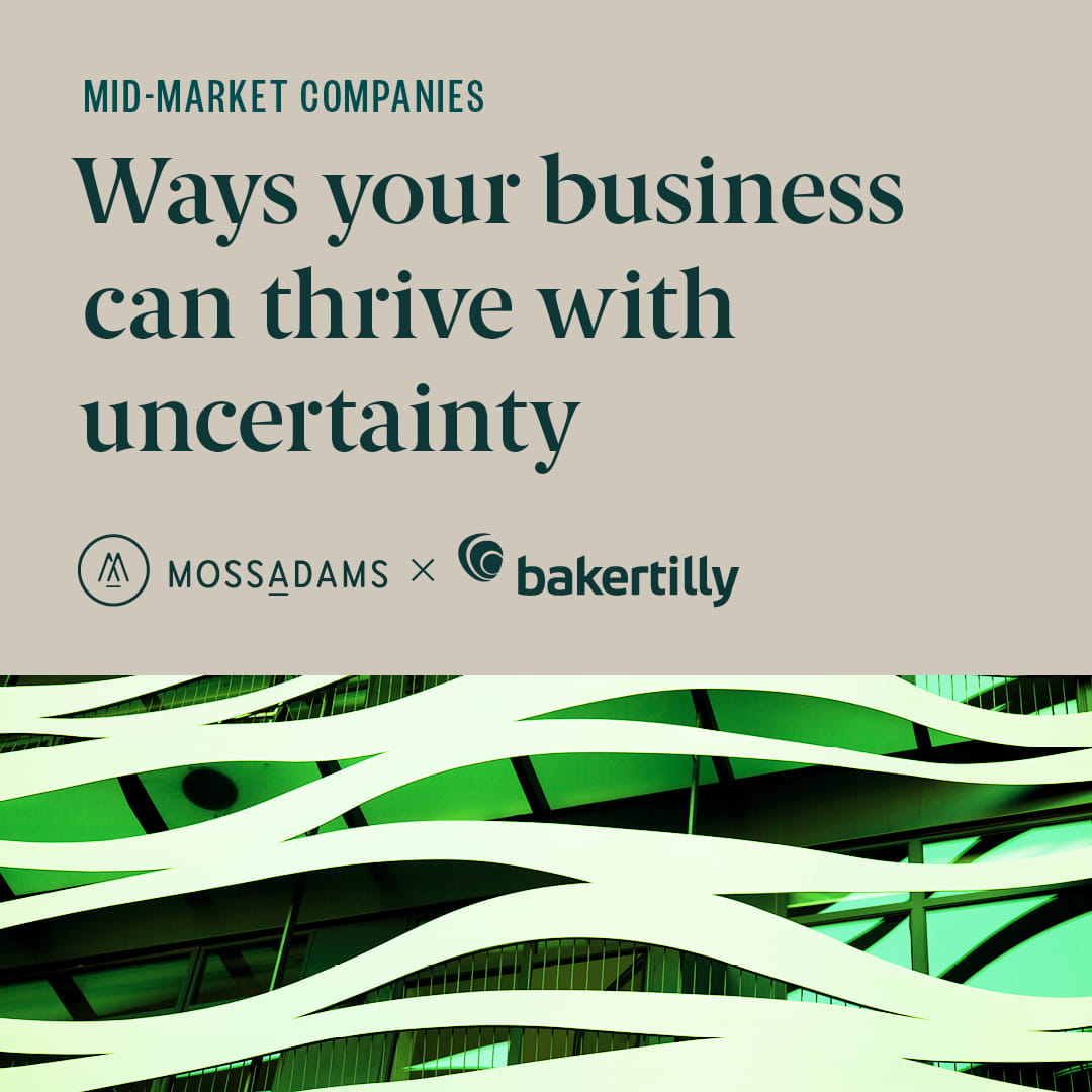 Baker Tilly US, LLP, Baker Tilly Advisory Group, LP and Moss Adams LLP and their affiliated entities operate under an alternative practice structure in accordance with the AICPA Code of Professional Conduct and applicable laws, regulations and professional standards. Baker Tilly Advisory Group, LP and its subsidiaries, and Baker Tilly US, LLP and its affiliated entities, trading as Baker Tilly, are members of the global network of Baker Tilly International Ltd., the members of which are separate and independent legal entities. Baker Tilly US, LLP and Moss Adams LLP are licensed CPA firms that provide assurance services to their clients. Baker Tilly Advisory Group, LP and its subsidiary entities provide tax and consulting services to their clients and are not licensed CPA firms. ISO certification services offered through Baker Tilly Certifications LLC. Investment advisory offered through either Moss Adams Wealth Advisors LLC or Baker Tilly Wealth Management, LLC.